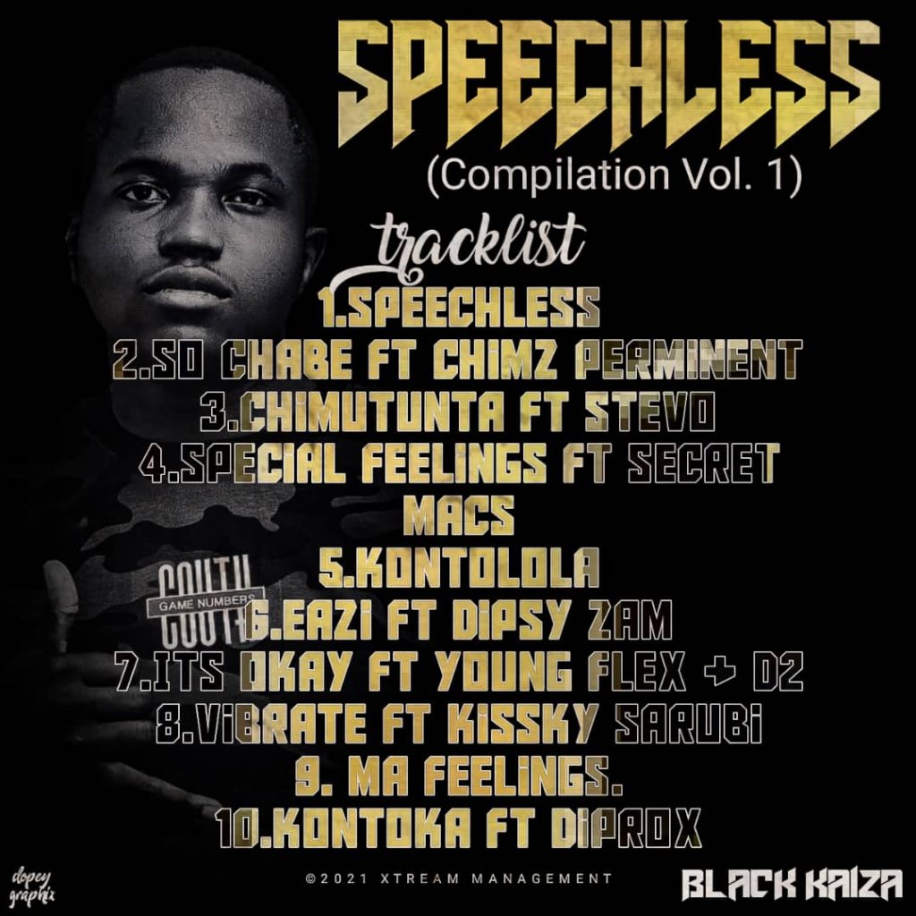 Xtream Management and Zambian Cliq run together to accomplish Black Kaiza first Compilation titled Speechless Compilation Vol.1 which contain ten tracks plus one bonus track on this massive Compilation Black Kaiza worked with Zambian talented rapper and singer’s such as Chimz Perminent, Dipsy Zam, Young Flex, Secret Macs, Stevo, D2, Kissky Sarubi, Diprox, and Karma.